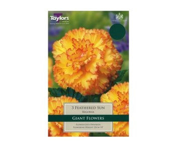 Begonia 'Feathered Sun' is an eye-catching, upright tuberous begonia variety known for its very large, showy, ruffled flowers and vibrant two-tone coloration. It is ideal for adding a splash of dramatic colour to containers and borders.