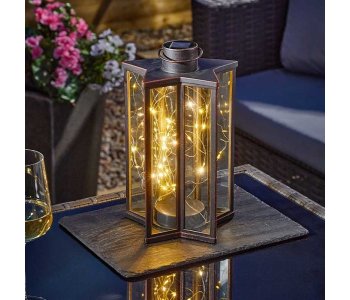 Bronze effect star shaped lantern with firefly lighting effect Charges in direct sunlight and automatically illuminates at dusk. 32 x 16 cm