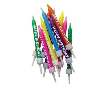 This pack of 12 candles come in a multi-coloured design with Happy Birthday down each candle. Great for fitting in with any birthday cake theme.