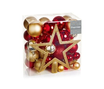 Decorate your tree with this pack of 50 mixed red and gold baubles including a glittery silver star topper.