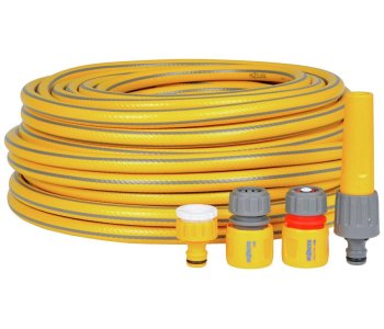The Hozelock 30m Starter Hose Set contains everything needed to start using a hosepipe. Good quality general purpose hose pipe with three-layered internal braiding to prevent kinking and to enhance hose pipe strength.