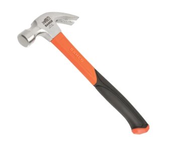 The Bahco 428 Curved Claw Hammer has an octagonal neck and a brightly polished round head. Fitted with a fibreglass handle for maximum shock absorption and a comfortable black hand grip. The shaft is painted a bright orange, making it easier to find in a toolbox.