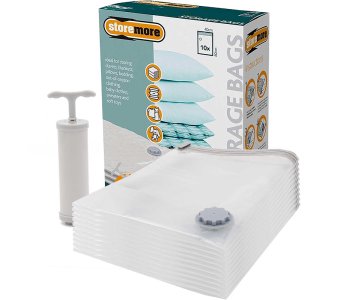 Quadruple the storage space around your home with the assistance of 10 vacuum storage bags. Complete with an included vacuum pump, you can reduce the size of seasonal clothing, quilts, blankets and duvets to a quarter of their normal size. During compression the vacuum system withdraws all the excess air from each storage bag, making sure the contents inside are airtight once sealed to protect against moisture, moths, dust and unwanted odours from affecting your linens during storage. This 10 pack of storage bags each measure in at 40x60cm, suitable for storing seasonal linens.