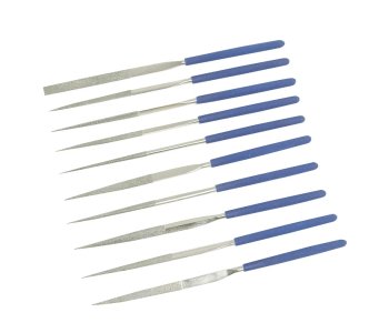 Assorted 140 x 3mm diamond needle files with high-grip vinyl handles. Includes flat parallel, flat taper, round, knife, half-round, 3-square and square files. Supplied in storage wallet.