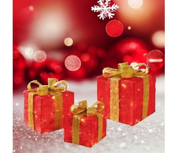 Set of 3 LED Light up Christmas Parcels / Presents Battery Operated - Red & Gold