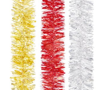 Chunky-cut tinsel in an assortment of colours. With a length of 2 metres, this tinsel is ideal for draping around the Christmas tree or as decorations around the house or even in the garden. Choose from either silver, gold or red to suit your colour theme.